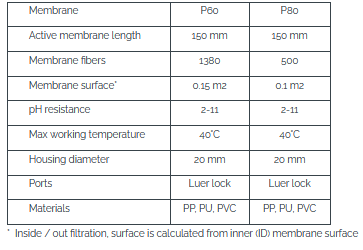 Dead end, inside / out filtration hollow fiber membrane module. Flow direction is indicated on the housing. It is possible to back flush. Intended for lab use, luer lock connections. Must be connected to hose.