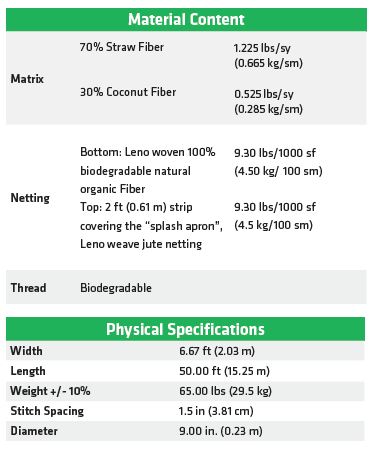 SediMax-FR shall be a machine-produced 100% biodegradable sediment filtration system. SediMax-FR shall be composed of 70% straw and 30% coconut fiber matrix evenly distributed over the entire area of the bottom netting. The SediMax-FR shall consist of a bottom netting and a 2 ft. (0.61 m) top netting that covers the matrix material on the “splash apron” of the SediMax-FR system. The netting shall be constructed from 100% biodegradable woven natural organic fiber netting. The netting shall consist of machine directional strands formed from two intertwined yarns with cross directional strands interwoven through the twisted machine strands (commonly referred to as a Leno weave) to form an approximate (0.50 x 1.0 inch (1.27 x 2.54 cm) mesh. The blanket shall be sewn together on 1.50 inch (3.81 cm) centers with biodegradable thread.