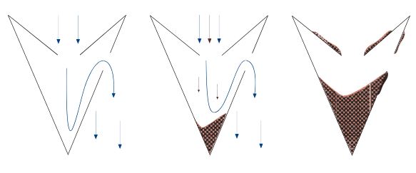 The paint particles which are heavier than air, follow tangent trajectories within the airflow and gradually accumulate in the retention pockets outside of the airflow.