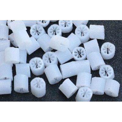 High Impact PolyStyrene (HIPS) is a very safe plastic used for this purpose. HIPS has a specific gravity of 1.05 g/cc which is almost neutral buoyant in water. They will form a packing against a current, either up or down flow. In some moving bed applications, Xtreme Bio Media can be agitated and moved easily with a use of a water jet or an air stone. They are very durable and never need replacement. The dimensions and the media extruded profile of the media had been chosen very carefully to provide the maximum biological/mechanical treatment during filtering and easily unpacked, dislodged dirt during backwash.
