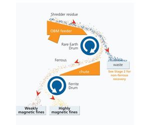 Material first passes over a Rare Earth Permanent Magnetic Drum (Stage 1a) to remove all ferrous metals from the shredder and then on to a Ferrite Permanent Magnetic Drum (Stage 1b) to separate the highly magnetic material from the weakly magnetic material.