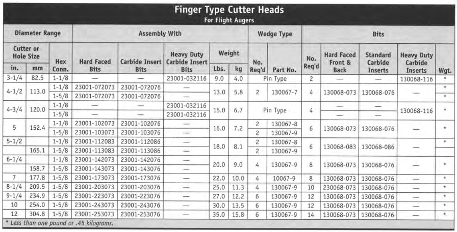 This drill head or "Cutter Head" is designed for use on Conveyor Flight type augers. The head is constructed of high quality steet and designed for use with hard faced or carbide inset type finger cutters. Carbide insert fingers are commonly used to drill reasonably hard rock and shales. The cutter head is held on the flight auger by means of a drive clip pin and rotated by the standard shank and socket connection. Finger teeth are held in place by a drive wedge or soft wire pins. Select cutter head diameter on basis of hole diameter desired and select flight size or diameter, about 10% less than cutter head diameter...or hole size.
