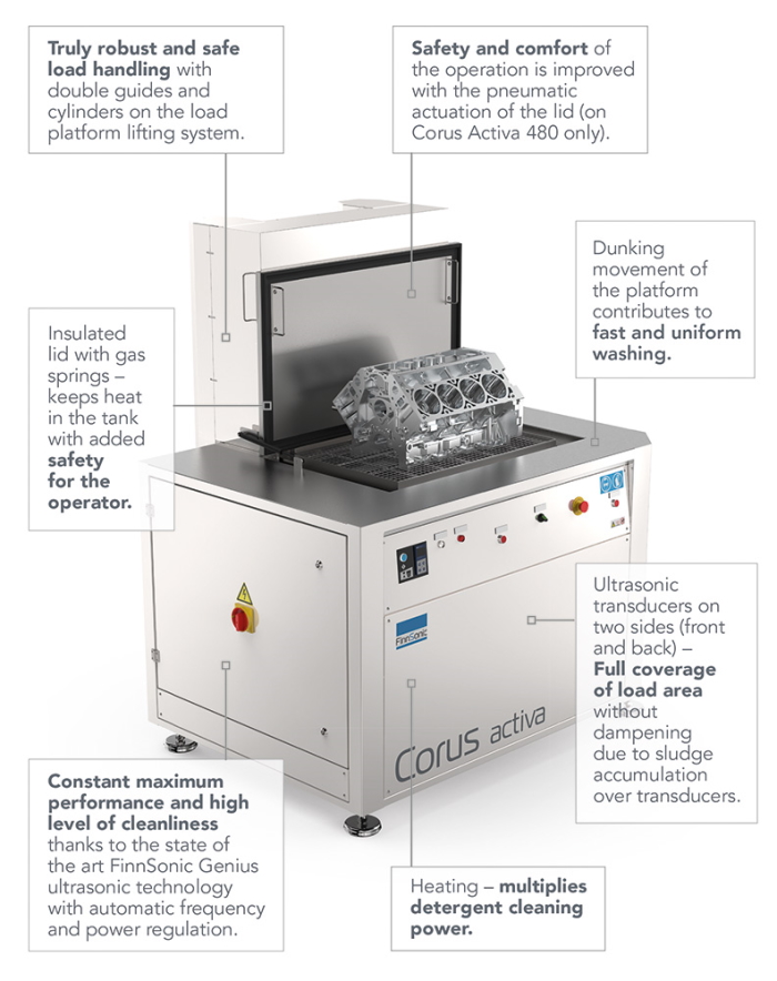 Safe and powerful maintenance cleaning. Ultrasonic cleaning is an extremely useful method for industrial maintenance cleaning. It cleans gently the hardest impurities from complex parts with only the minimal manual intervention. The cleaning process is safe in an enclosed space. It is also environmentally friendly with no need for harsh chemicals and with low energy and water consumption. FinnSonic Corus Activa is optimized for industrial maintenance cleaning of complex parts. Corus Activa models are equipped with a truly robust integrated load platform. Sturdy platform makes loading and unloading of parts easy and safe. Platform also provides dunking movement during treatment cycle, which results in faster and more uniform cleaning with ultrasound.