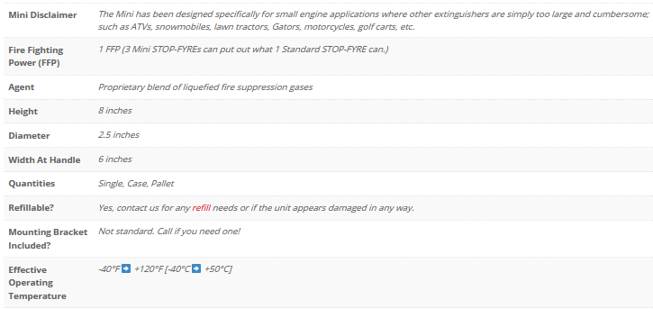 The Mini has been designed specifically for small engine applications where other extinguishers are simply too large and cumbersome; such as ATVs, snowmobiles, lawn tractors, Gators, motorcycles, golf carts, etc. Our customers wanted the power and cleanliness of STOP-FYRE®, but in a smaller size to fit in areas where storage space is very limited.