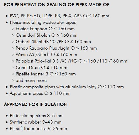 Penetration sealing of flammable supply/disposal pipes. For flammable pipes. Building services: wastewater, rainwater, drinking water, gas, heating, cooling, compressed air, pneumatic tube.