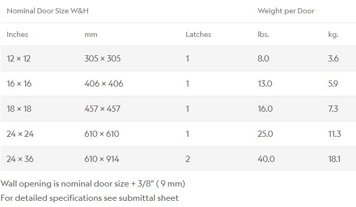 The Acudor FW-5015 is a fire-rated access door, recessed for drywall walls. Material: Steel Door 22 gauge. Mounting Frame: 22 gauge. Door: Recessed 5/8". Door Frame: Galvanized steel drywall taping bead on all sides. Hinge: Concealed. Standard Latch: Self-latching bolt, operated by flush key. Finish: Satin coat steel.