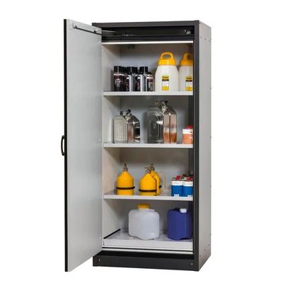 Asecos fire resistant cabinet, 30-min fire rated, 3 Shelves, 1 Door, Model Q30. This Flammable Storage Cabinet provides safe and approved storage of flammable hazardous substances in working areas. Construction fire rated for 30 minutes. Body color Anthracite Gray, with wing doors in Warning Yellow. Interior equipment includes 3 shelves, 1 perforated insert, 1 bottom spill sump (sheet steel powder-coated).