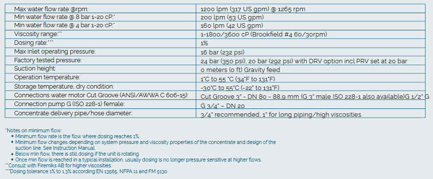 1% dosing system for firefighting - for fixed installations connected to a concentrate tank with gravity feed to the dosing piston/plunger pump. Extinguishing water drives the volumetric water motor, which in its turn drives the positive displacement concentrate piston/ plunger pump that doses the correct amount of foam concentrate in the extinguishing water