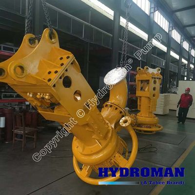 Hydroman™ Fishfarm pond hydraulic dredge submersible slurry pump operated via hydraulic motors installed in submersible dredge pump driven by hydraulic system or hydraulic power pack, then hydraulic motors drive the pump impeller and cutter (cutters are used for sir the hard sand or mud) to rotate at high speed, and then pump suction slurry and discharge them to far place via discharge hoses. Hydraulic submersible mud pump is used for delivering liquid contained sand, coal conder solid etc, The hydraulic submersible dredging sand pump can be mainly employed in clearing the mud in lake, river, sea and widening channel etc., Hydraulic submersible pumps also can be applied to clear out sewage pool, in building site, steel wokrs and power station.