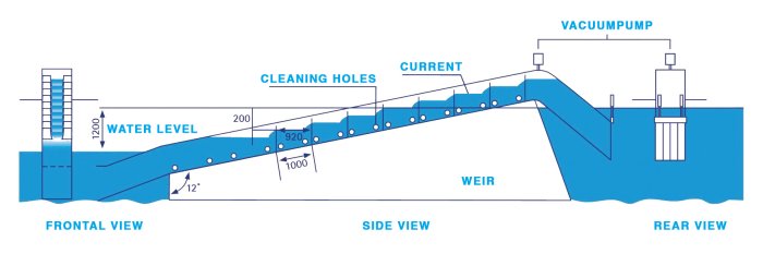 The FishFlow siphon fish ladder is based on the principle of a poorly functioning siphon; i.e. a siphon with an air bubble. This bubble is an essential element of the construction because the volume of the bubble defines the flowrate through the system. The siphon fish ladder is equipped with a vacuum pump that controls the volume of the air bubble to prevent change of flowrate due to import or export of gas from the water. An aeration valve is provided as a safety precaution to make sure that the siphon can not start running at its maximum flowrate in case the vacuum pump would malfunction and pump uninterruptedly. The water that is being siphoned consequentially flows over a conventional fish ladder to the downstream section of the river or stream.
