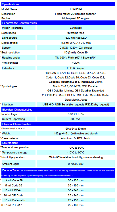 The FS5020M represents the premium level of data collection devices. Using advanced 2D imaging technology, FS5020M 2D fixed-mount barcode reader provides a solution for OEM use into self-service kiosks, price checker, ticket readers, document handling, as well as vending machines. Designed for easy integration, the FS5020M 2D Fixed-mount barcode scanner provides a plug-and-play solution for system designers. The FS5020M features outstanding reading, high motion tolerance, snappy reading, and also offers excellent performance on some DPM codes. .