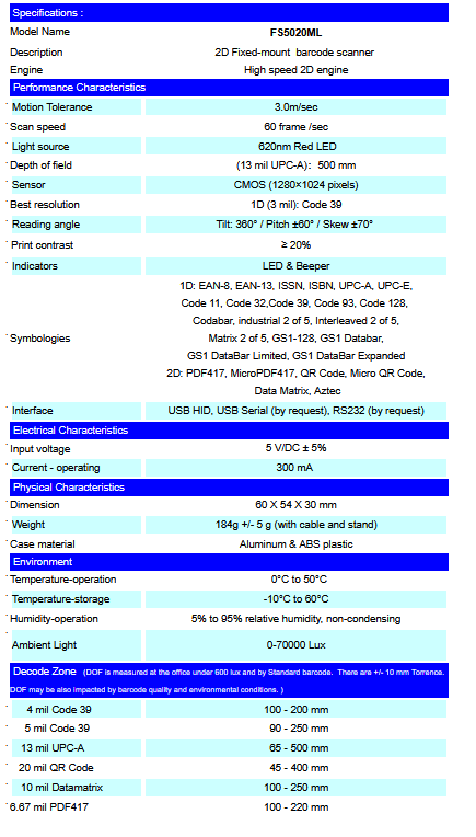 The FS5020ML represents the premium level of data collection devices. Using advanced 2D imaging technology, FS5020ML 2D fixed-mount barcode reader provides a solution for OEM use into self-service kiosks, price checker, ticket readers, document handling, as well as vending machines. Designed for easy integration, the FS5020ML 2D Fixed-mount barcode scanner provides a plug-and-play solution for system designers. The FS5020ML features outstanding reading, high motion tolerance, snappy reading, and also offers excellent performance on some DPM codes. .