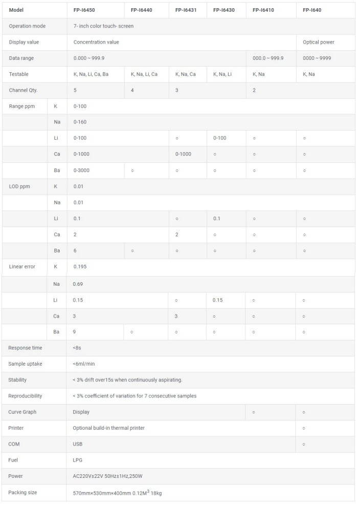Direct concentration display (Don’t cover FP-I640). Automatic calculation of correlation coefficient (Don’t cover FP-I640). Pre-selection of flame sizes. Flameout protection device. Measuring range changing. Concentration units selectable. Multilingual user interface. Air compressor provide.