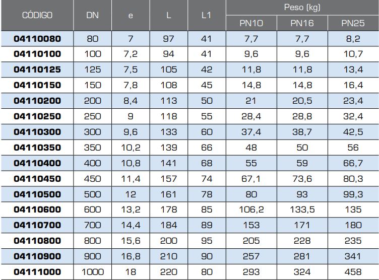 Size in accordance with the EN-545 standard. Operating pressure: PN10, PN16 and PN25.