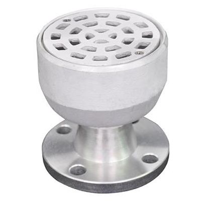 Cast in aluminum, with a heavy duty aluminum strainer plate that is secured with stainless steel flat head screws. A trap and baffle allow for drainage, while preventing sewer gas from escaping into the atmosphere. Available in sizes 1.5” – 3”. Also available in galvanized steel with a bronze strainer plate.