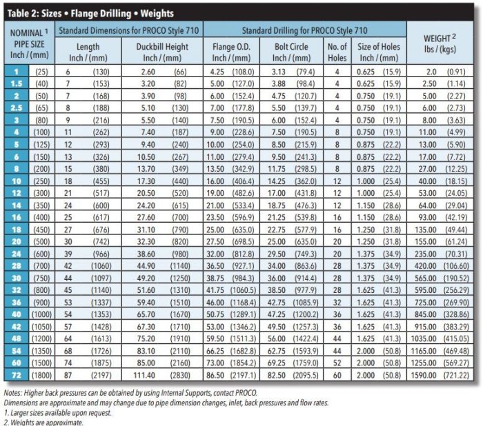 TheProco ProFlex Style 710 flanged duckbill check valve is designed to bolt directly to both existing flanges, as well as new installations. The flanges are drilled 150# standard, however other drilling standards are available upon request. The ProFlex Style 710 can be installed in either a vertical or horizontal application.