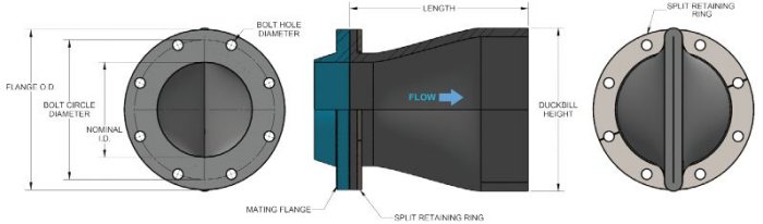 The ProFlex 710 Rubber Duckbill Check Valves come standard with ANSI 125/150 flange drilling and can also be supplied with DIN, JIS, BS or AS flange patterns.