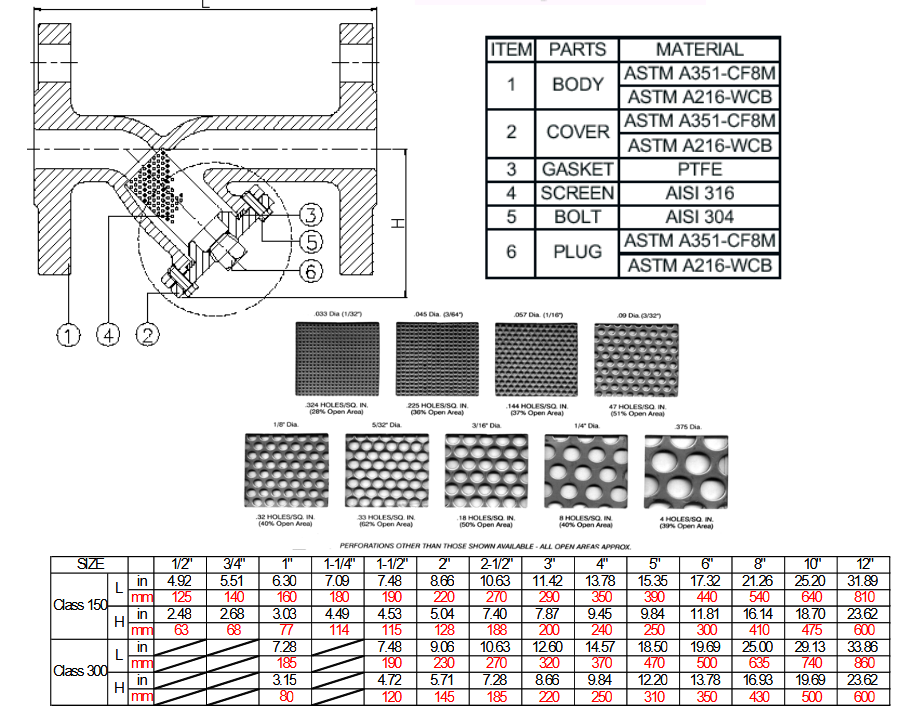 316 SS screens 1/4" mesh. Max. working temperature 445 F Options: Blow down valve. Various size screens and mesh liners.