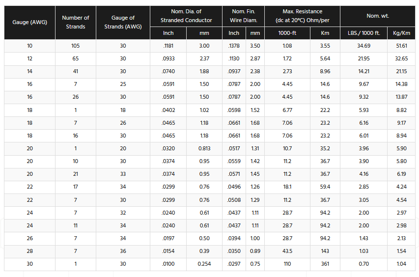 Conductor material of Tinned or Bare copper. Rated temperature 105 c. Rated Voltage 30 V (Spark voltage 1500 V). Flame resistance FT2. RoHS Compliant.