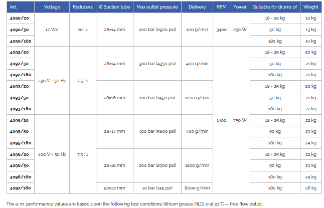 Electric pumps for the supply of grease and for high pressure lubrication in dispensing lines if only electrical power is available. This series allows the combination of 3 different motors with different suction tubes and different planetary reduction gears, thus offering a total of 16 combinations which permit suitable solutions for various requirements.