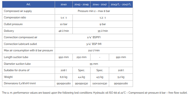 Pneumatic pumps for the transfer of low viscosity oils and antifreeze at high delivery and short pumping distances.
