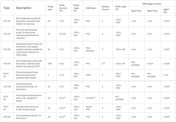 a: Additional (worst case) error due to DL6 Data Logger at -10 to +50 °C. b: Additional (typical) error due to GP1 Data Logger at 0 to +60 °C. c: Additional (worst case) error due to GP2 Data Logger at -20 to +60 °C. d: Co-axial single-core with screen acting as signal loop. e: Over 0-70 °C. f: Teflon lead, vinyl tip.