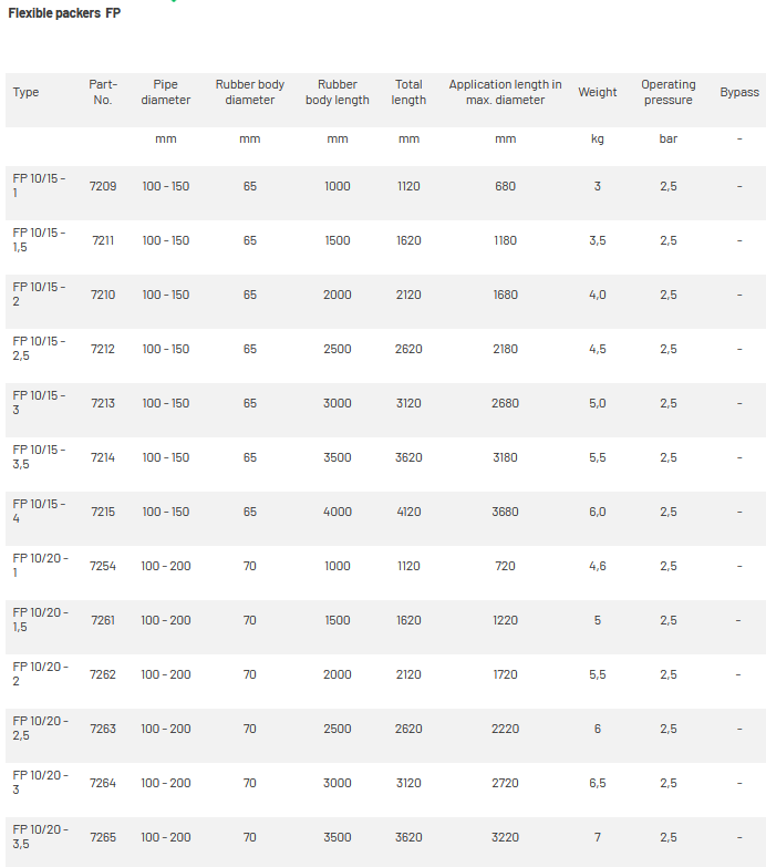 Flexible packers are provided with a singlelayer rubberized-fabric sleeve with metal faces with wheels at both their ends. The wheels ensure the stability of the packer in the pipiline. This design allows water to flow freely during the repair. The  effective surface ranges is from 600 mm to 3680 mm. The flexibility allows easy instalation in the pipeline.