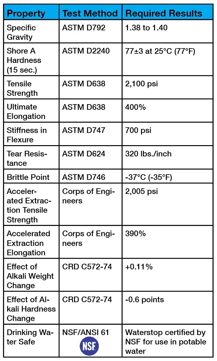 - Flexible Polyvinyl Chloride (PVC) Waterstop shall be independently certified for use in potable water per NSF/ANSI Standard 61. Third-party certified documentation to be provided by the manufacturer.