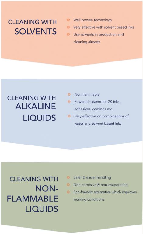 Automated cleaning is not only the best way clean your parts, but it also makes your workflow more efficient, organized and helps you avoid downtime. Our fully-automatic washing units are designed to wash all of the press parts from your wide web presses. They wash ink trays, doctor blades, aniloxes and other removable press parts. It is effective on all types of ink.