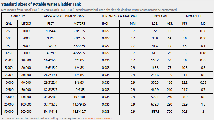 Flexible Potable Water Tank(Pillow Tank) designs for short or long term drinking water storage and transportation; Easy to Use: Unfold, Filling, Done. Inflatable Potable Water Bag widely use in storage of drinking water in construction site, city minucipal water supply, oudoor activity, rural area, military water sources,etc. Perfect choice water storage indoor&outdoor. Collapsible Drinking Water Container, using Heavy Duty sheet, more flexibility, lighter, stronger; eg: 10m3 tank only 0.25m3 packing. Each Potable Water Bladder Tank go through air pressure tested before shipment, Safe, Reliable are our purpose.