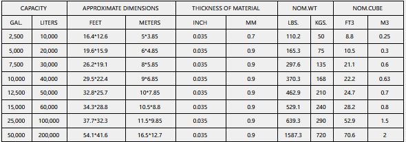 Large, common sizes from 2,500gal(10,000L) to 2,500,000gal(1,000,000L).