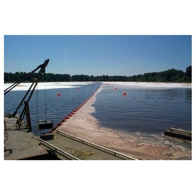The Mk 7 baffle is constructed of heavy duty geomembrane material that is highly resistant to chemicals found in waste and industrial water applications. The Mk 7 fabric is woven polyester coated with X3-5. It has solid molded closed cell polyethylene foam flotations with a stainless steel mounting, elastomeric coated top tension and a bottom skirt galvanized chain or steel bars. All anchoring and connector hardware is included.