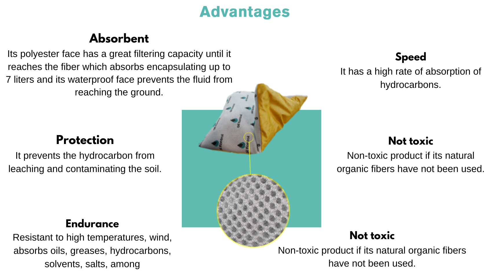 Blanket made with 100% 3D polyester fabric, with uv protection to prolong its useful life outdoors, 1 m x 2 m, filled with 9 kg of bio-absorbent collagen fibers, 100% organic, oleophilic, hydrophobic, fire retardant, harmless to the environment. Absorption and encapsulation capacity up to 63 liters of hydrocarbon per blanket.