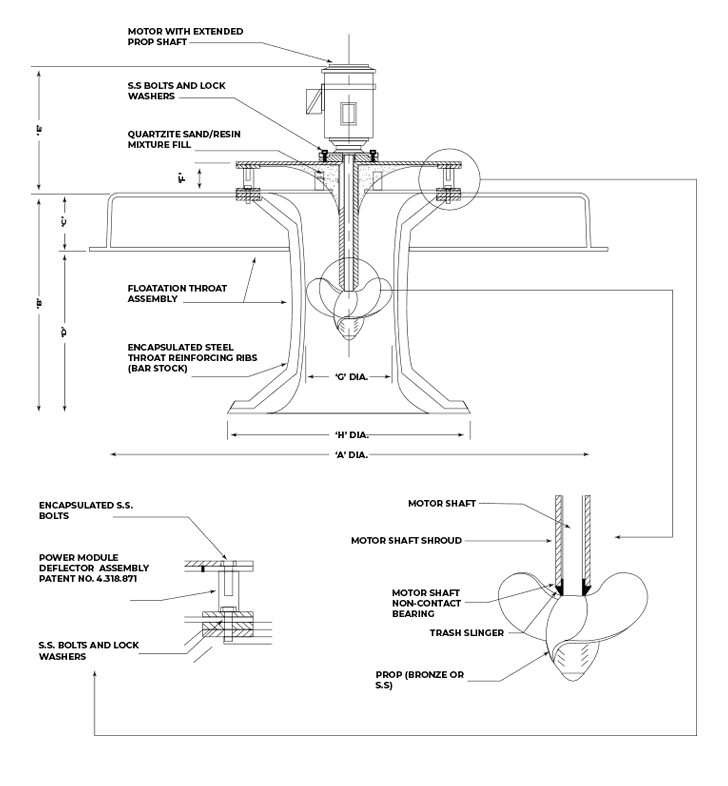 Utilizing computer-aided design and unitized fiberglass construction. The EEE Floating Aerator has the smoothest curved intake, volute, and discharge passage of any surface lagoon aerator. The naturally curved intake bell-to-volute-to-discharge design promotes the highest gallon-per-minute rating of any aerator on the market. Less efficiently designed competing aerators actually retard water flow and efficient oxygenation. The EEE diffuser is not only 150% to 400% heavier but also larger in diameter to eliminate spray-back. Spray back that could otherwise freeze and corrode the motor.