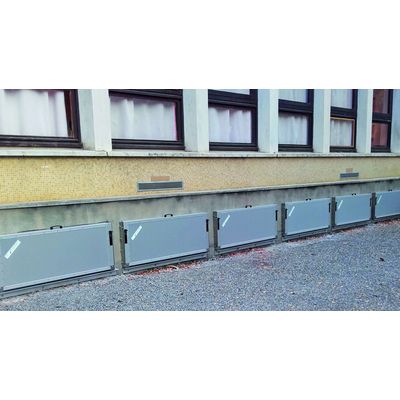 The flood barrier designed primarily for private homes and collective housing. Cellular-Aluminium Barrier. Custom-made. Installs and dismantles in 5 minutes. Height of boards: 410 or 610 mm juxtaposable. Light to transport. Easy to handle thanks to integrated handles. Feugier Poseidon leviers intégrés. Board horizontally and vertically compressed by integrated levers.