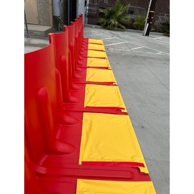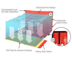 The Mayim™ MAX flood control barrier is an easy to deploy flood control system that installs quickly and stores compactly. Sections are simply laid next to each other and connected using the unique insert and lock connection system. The Mayim™ MAX can handle uneven surfaces with the extended flap that will conform to the ground and flexible curve pieces to adjust to any angle. When the Mayim™ MAX barrier is ballasted by water, rising waters increase the ability of the flood barrier system to hold back flood waters, providing damming and water diversion abilities.1) Water Pressure Creates Support
