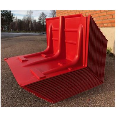 Gradual curves are made by connecting the boxes at a slight angle, and for corners there are specific corner boxes. The Boxwall can also be used during a flash flooding event to divert water away from vulnerable areas. A number of boxes are put in the flowing water and will stick directly to the ground.