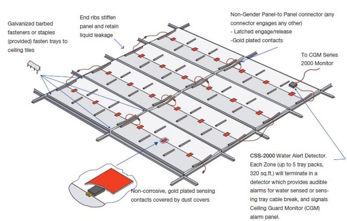 The system is designed to detect and provide indication of small amounts of leakage before the leakage accumulates to the point of leaking through, or along the edges of the tiles to the area below. Installing Ceiling Guard provides a very high degree of protection against leakage from concealed piping and the roof or floors above the suspended ceiling.