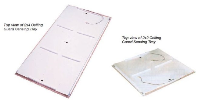 The flame retardant plastic sensing trays making up Ceiling Guard are sized to cover either the conventional 2’x4’ or 2’x2’ ceiling tiles. The smallest amount of water leakage into any sensing tray quickly finds its way to a sensing contact located in the trough of the tray thereby activating the associated detector.