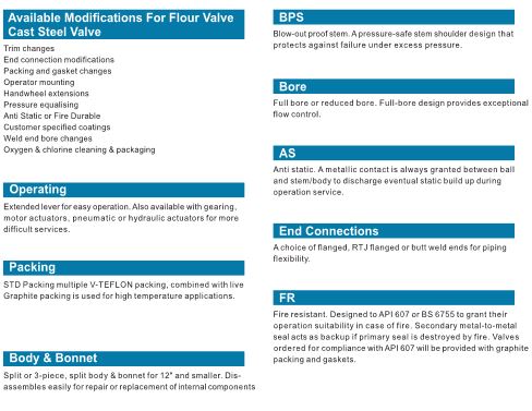 Flour Valve steel ball valves are designed and manufactured lo provide maximum service life and dependability. All ball valves are full ported and meet the design requirements of American Petroleum Institute standard API 608 & API 6D, British standard BS 5351 and gene-rally conform to American Society of Mechaniclal Engineers standard ASME B16.34. Valves are available in a complete range of body/bonnet materials and trims.