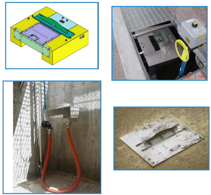 The 11800-DH has flow-controlled weirs with adjustable flow rate capabilities. The standard flow rate is 3 cubic meters per minute per meter of weir. The 11800-DH has 0.5 meters of total weir, and therefore is normally operated at a flow rate 1.4 m3/min, 370 gal/ min. Maximin flow rate is 500gpm. The 11800-DH excludes solid during the aeration cycle. Installation options include an articulating pipe swing arm or flexible hose deployment. The system can be gravity drained or pumped. Deployment is based on site-specific conditions.