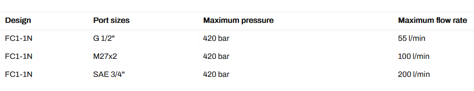 Flow control valves of this product group are used to supply single acting hydraulic consumers, such as hydraulic motors, hydraulic hammers, etc. with a controlled flow rate. This volume flow is divided of a main volume flow by means of the flow control valve. The flow control valve of the design 1N can be used as a 2-way or 3-way flow controller (pressure compensator) for flows up to 200 l / min and enables the operation of additional single-acting consumers. The additional consumer can be operated simultaneously to the normal machine functions. The volume flow and pressure to the auxiliary function is independent of the pressure and the volume flow of the main functions in the machine.
