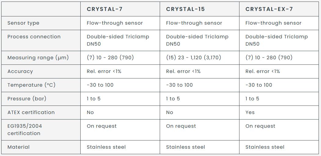 The CRYSTAL flow sensor is a specialized tool designed for inline applications in pipes or narrow apparatus, particularly adept at monitoring particles such as crystals, bubbles, or droplets in liquids. It produces high-contrast, true-to-scale imaging for precise analysis and control. The sensor features a variable measuring gap that allows for accurate measurements without obstructing fluid flow, catering to a measuring range from 10 to 3,170 µm, depending on the model variant. Notable for its precision, the sensor operates within a relative error of less than 1%. Constructed from stainless steel, it withstands temperatures from -30°C to 100°C and pressures ranging from 1 to 5 bar. While the Crystal-EX-7 model holds ATEX certification, other models require requests for EG1935/2004 certification. The sensor is supported by SOMA Workspace software, enhancing functionality with real-time data processing, customizable system control, and detailed reporting. This combination facilitates dynamic process management, adaptable to varying production requirements.Most popular related searches