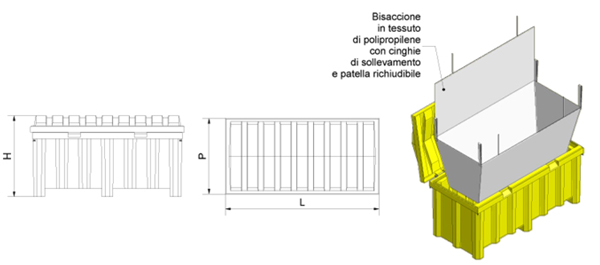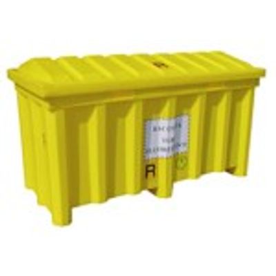 Polyethylene container for the Fluorescent Pipe (neon) disposal respecting the regulations of the Legislative Decree n°152 part IV of 3 April 2006. Container to store fluorescent lamps (neons) completely made of polyethylene, yellow, adequate to the storage of fluorescent lamps, equipped with closable and removable internal flexible tank. To be stacked on pallets to be easy to handle with transpallet fork-lift trucks, equipped with a cover which covers it all, ensuring its tightness. One internal tank is included in the pack.