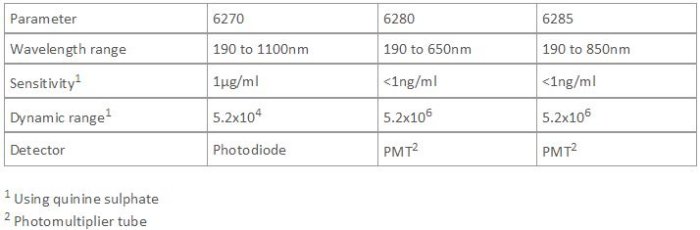 Jenway offers three fluorimeter models to cover a wide range of applications and fluorscence measurements. The 6280 fluorimeter model is ideal for the most sensitive determinations with emission wavelengths up to 650nm. When higher emission wavelengths are required the 6285 fluorimeter with its red-enhanced detector is the unit of choice. For less sensitive applications and a broader wavelength range up to 1100nm the low cost 6270 fluorimeter unit is more