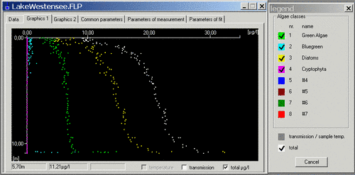 The screenshots below show examples of profiles of algae distribution in the Plussee (lake in Northern Germany) recorded in June 1999. The measurements were made at the same location at 10:00 a.m. and 12:00 noon respectively. The chlorophyll of the dinoflagellates were predominant in the group given in yellow. The change in the depth profile can be traced back to a vertical movement of the dinoflagellates, which actively moved to a deeper level due to adaptation to the current nutrient level.