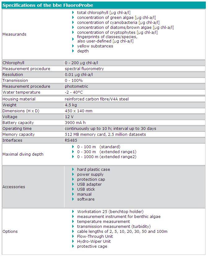 The instrument for algae class differentiation and total chlorophyll measurement. The bbe FluoroProbe is a highly sensitive measuring instrument for the analysis of chlorophyll-a with algae class distinction. Individual profiles during the measurements are taken for green algae, blue-green algae/cyanobacteria, diatoms/dinoflagellates and cryptophytes. This enables the analysis of the occurrence and distribution, of e.g. blue-green algae, on site without the necessity of the laboratory. Possible interferences due to yellow substances are eliminated by an integrated CDOM correction factor. The FluoroProbe can quickly and reliably determine the chlorophyll content of different algae classes down to a depth of 100m (optionally 1000 m). The measurement data can be displayed in real time on a PC or be stored in the probe for subsequent evaluation.