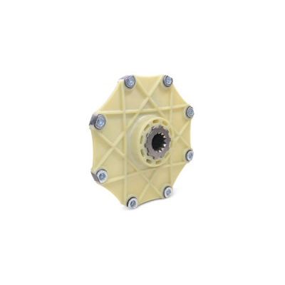 Guardian has introduced the DELTA Series flexible coupling line for use on diesel-driven hydrostatic machinery and construction equipment. The cost effective DELTA single-piece design incorporates a splined and hardened steel hub that is pre-assembled into the glass-fiber reinforced flange. The DELTA coupling attaches to the engine flywheel, taking advantage of elastomeric grommets that provide a steady dampening effect to normal engine vibrations. Although the coupling incorporates rubber bushings for dampening, it is relatively stiff which allows equipment with low inertia to operate below the critical speed range.