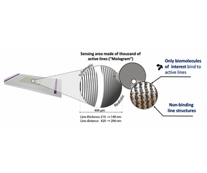 The stripe pattern you get with focal molography is as described called a mologram. The company has several molograms arranged on a small chip, measuring different molecules on a chip. Bound biomolecules on it function as detectives that recognize the target analyte in the sample through molecular recognition and selective binding and thereby emit a light signal. It is really small with a diameter of 0,4 millimeter and consists of 1,000 very fine stripes. In comparison, the focal point on to which the laser light is focused by it has a diameter of about 1,000th of a millimeter. The possible applications with this technology, being a nanotechnology-based method, are immense and range from real-time measurements to quality control of assay performances.