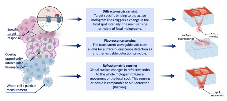 Combined with the right surface chemistry and recognition elements on the sensor surface focal molography enables robust, sensitive and fundamentally new BIA assays such as the direct and label-free monitoring of biomolecular interaction on the cell membrane.